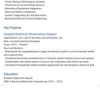 Ordinary National Diploma (OND) in Electrical Engineering Federal Polytechnic, Bauchi September 2019 – [Month, Year of Completion] Completed a two-year diploma program with a strong emphasis on electrical and electronic systems. Key areas of study included electrical circuit theory, power systems, electrical machines, installation techniques, and industrial safety. Gained hands-on experience through practical laboratory sessions and the Student Industrial Work Experience Scheme (SIWES), where I assisted in the installation, maintenance, and troubleshooting of electrical equipment in real-world settings.